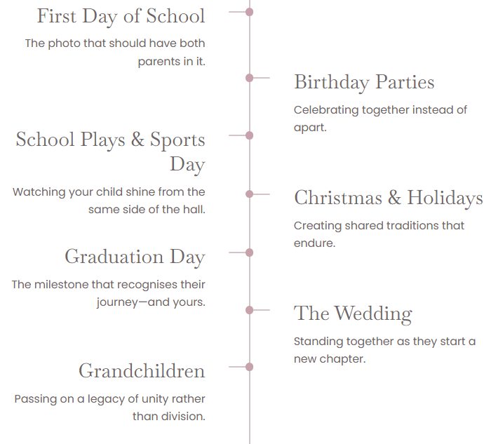 The real stakes of unresolved conflict are not abstract. They are the moments that cannot be recovered. A child's birthday party where one parent is absent. The first day of school — the photograph that only one parent is in. The school play watched from opposite ends of the hall. Sports day. The nativity. Parents' evening. These are not rare occasions — they are the fabric of a childhood.