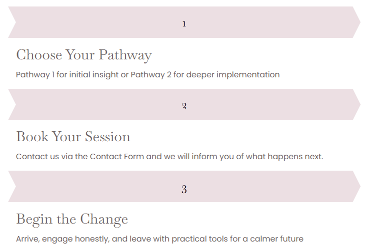 There is no obligation to commit to anything beyond the session you choose. You can begin with the three-hour Foundational Clarity Session, take stock of what you gain, and decide from there. Or, if you are ready to go deeper from the outset, Pathway 2 offers the comprehensive, personalised framework to get you there.